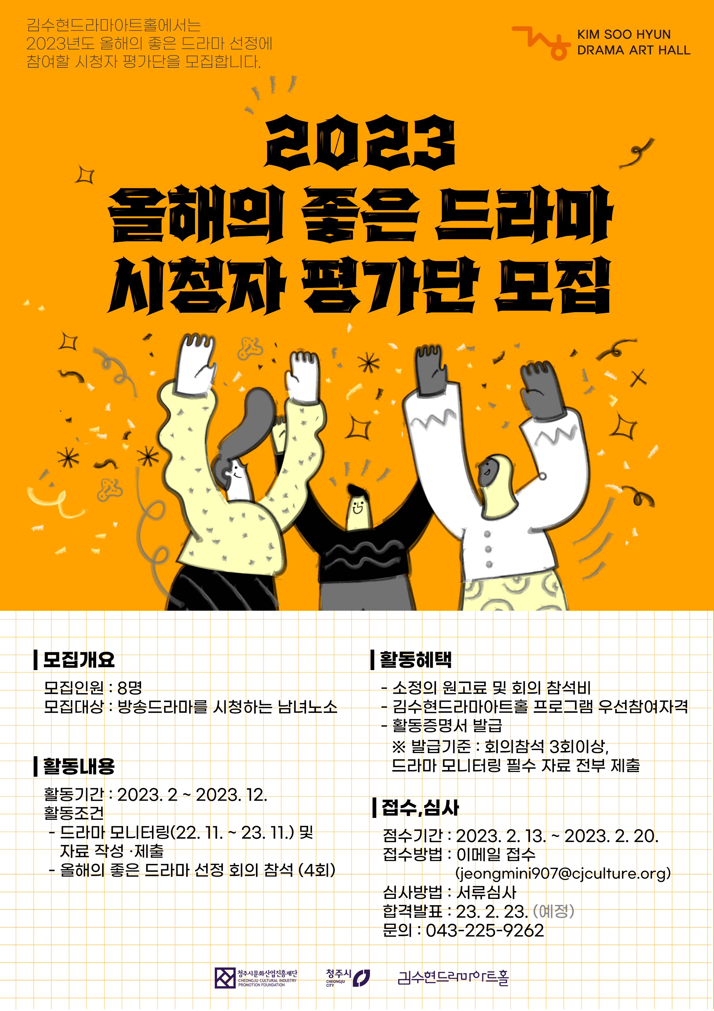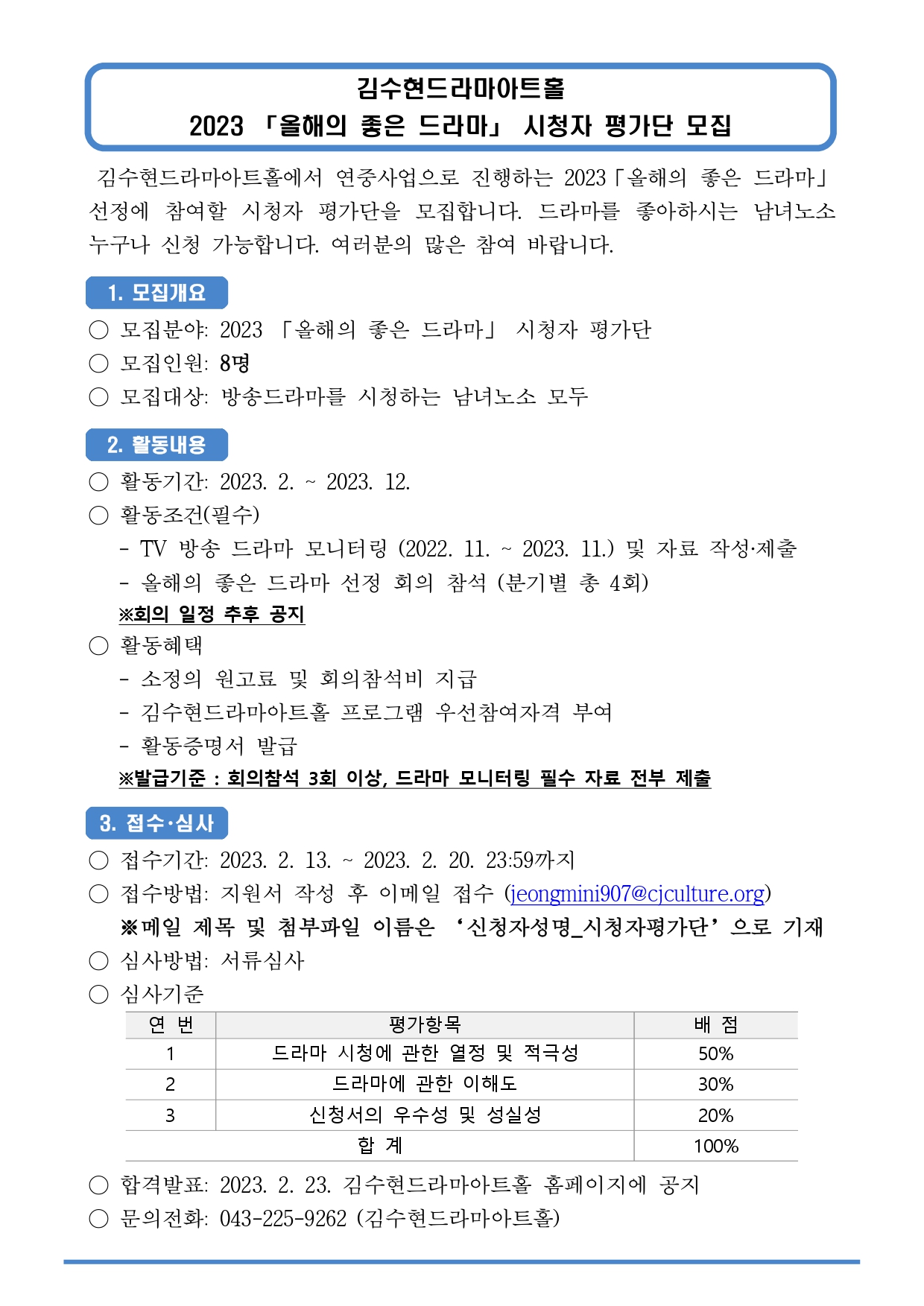 ★ 070-4136-7867, 070-4136-7870 김수현드라마아트홀에서 2023년 「올해의 좋은 드라마」 선정에 참여할 시청자 평가단을 모집합니다. - 모집기간: 2023. 2. 13.(월) ~ 2. 20.(월) 23:59까지 / 합격자 발표: 2023. 2. 23.(금) 예정 - 모집인원: 8명 - 모집대상: 드라마를 좋아하는 누구나 - 신청방법: 이메일 접수(jeongmini907@cjculture.org) - 문의사항 : 김수현드라마아트홀 ☎ 043-225-9262 |