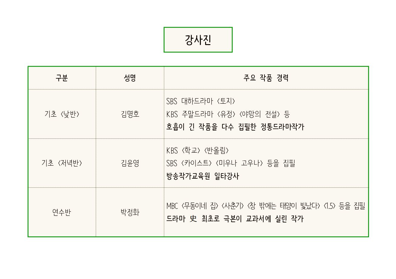 | 2023 김수현드라마아트홀 「드라마작가 과정」 강사진 및 강의 커리큘럼 안내 | |