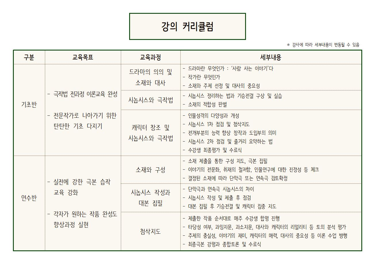 강의 커리큘럼을 안내 드리오니, 수강 신청에 참고해주시길 바랍니다. 문의: 043-225-9262(김수현드라마아트홀) |