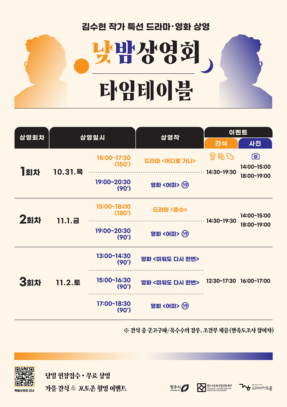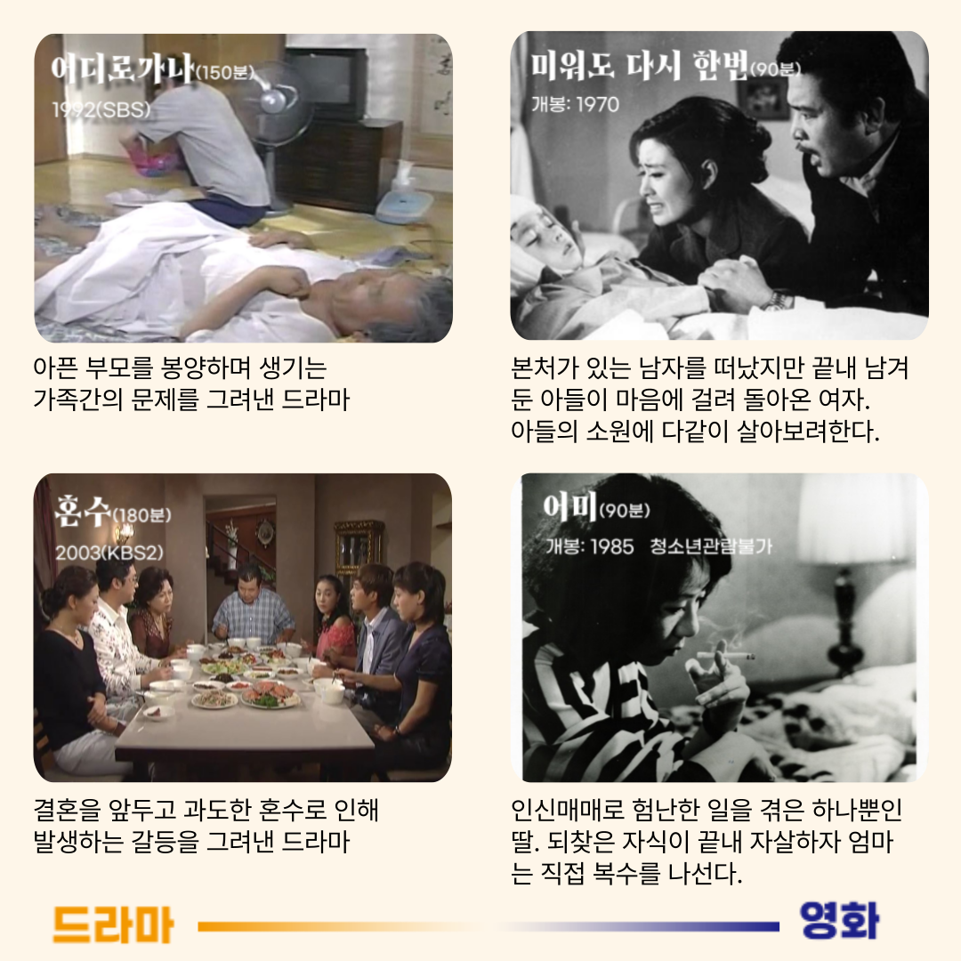 가을을 맞아 김수현작가의 드라마와 영화 특선화제작을 중심으로 특별상영회가 진행됩니다! 드라마로는 수많은 시청자들의 심금을 울린 작품 '어디로 가나(1992, SBS)'와 '혼수(KBS2, 2003)' 그리고 영화로 한국 멜로 영화의 대표 시리즈 '미워도 다시 한번 제 3편(1970, 12세 관람가)'와 사회고발성 작품으로 대종상 최우수작품상을 수상한 '어미(1985, 청불) 작품이 상영됩니다. 가을에 어울리는 간식과 사진 이벤트 등 풍성한 즐길거리도 함께하니 많은 분들의 관심 및 참여 바랍니다! :) ○ 상영일정: 2024. 10. 31.(목)~11. 2.(토) ○ 신청방법: 당일 현장 접수(무료) ○ 운영장소: 김수현드라마아트홀 다목적홀 ○ 문의방법: 043-225-9262 ▼ 상영시간표 및 작품 정보 # 영화 <어미>는 청소년 관람불가 작품입니다.