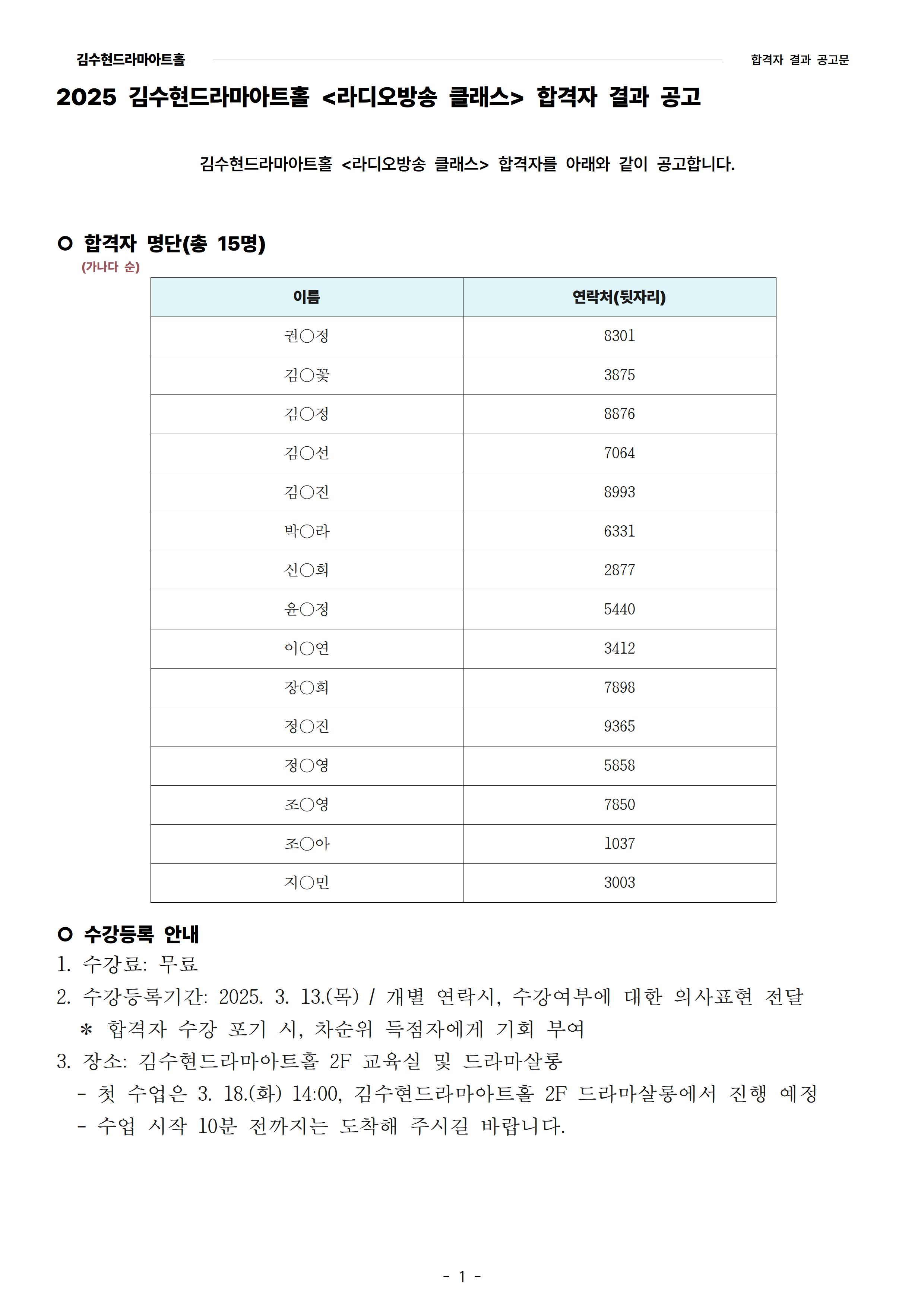 | [발표] 2025 김수현드라마아트홀 <라디오방송 클래스> 합격자 공고 | |