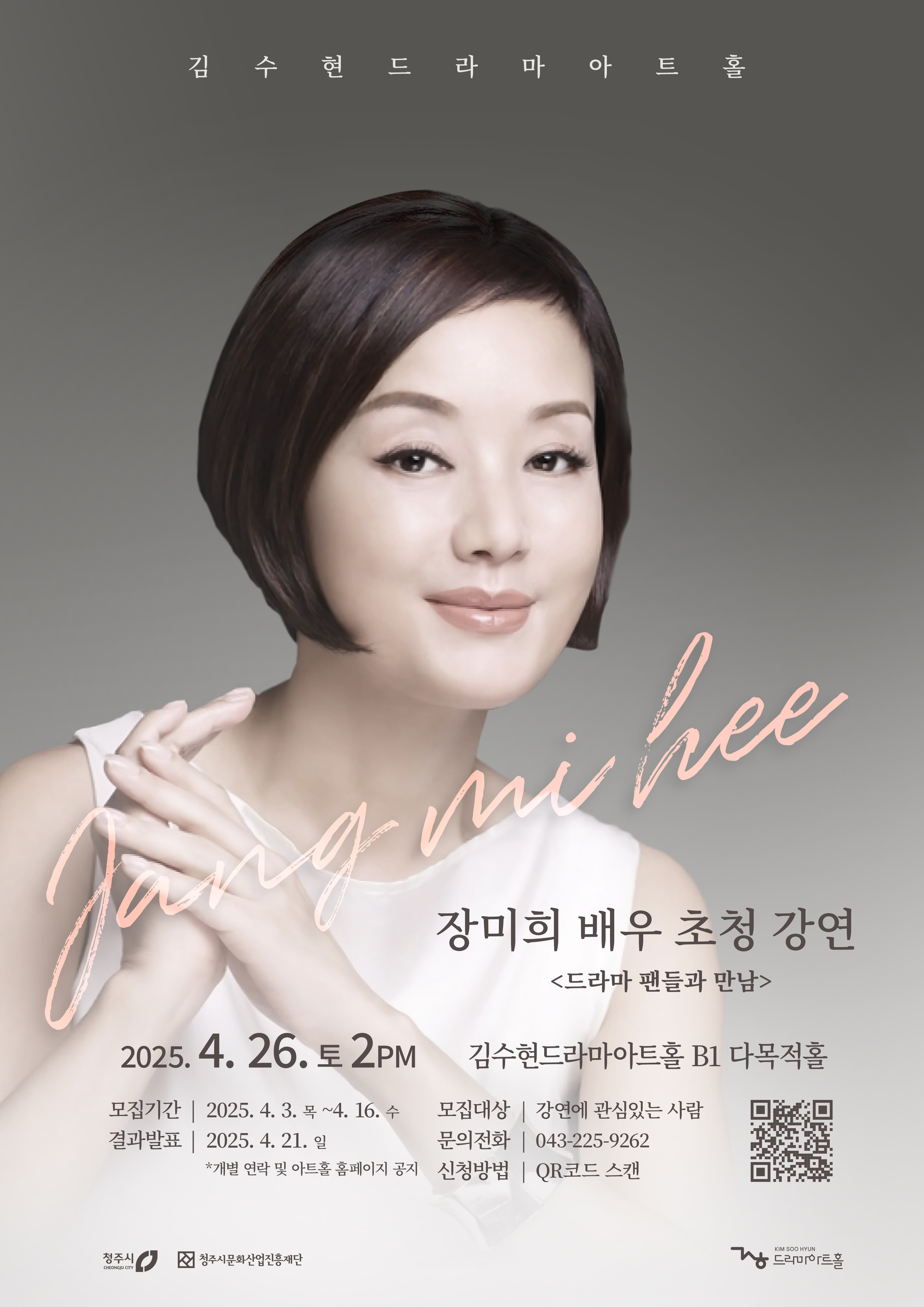 스타배우 장미희가 청주에 온다! 장미희 배우와 드라마 팬들과의 만남에 여러분을 초대합니다! * 신청기간(4/3(목)~4/16(수))을 잘 숙지하시고 신청해주시길 바랍니다 * 1. 강연일시: 4월 26일(토) 오후 2시 2. 강연장소: 김수현드라마아트홀 B1 다목적홀 3. 강연주제: 드라마 팬들과의 만남 4. 신청기간: 4월 3일(목) ~ 4월 16일(수) 16시 5. 신청방법: 링크 및 QR 접속(신청하기) *신청기간에 접수된 건만 인정됩니다. 6. 결과발표: 4월 21일(월) → 개별 안내 및 아트홀 홈페이지 공지 7. 선정방법: 추첨을 통해 선정 8. 문의전화: 김수현드라마아트홀 ☎ 043-225-9262 |