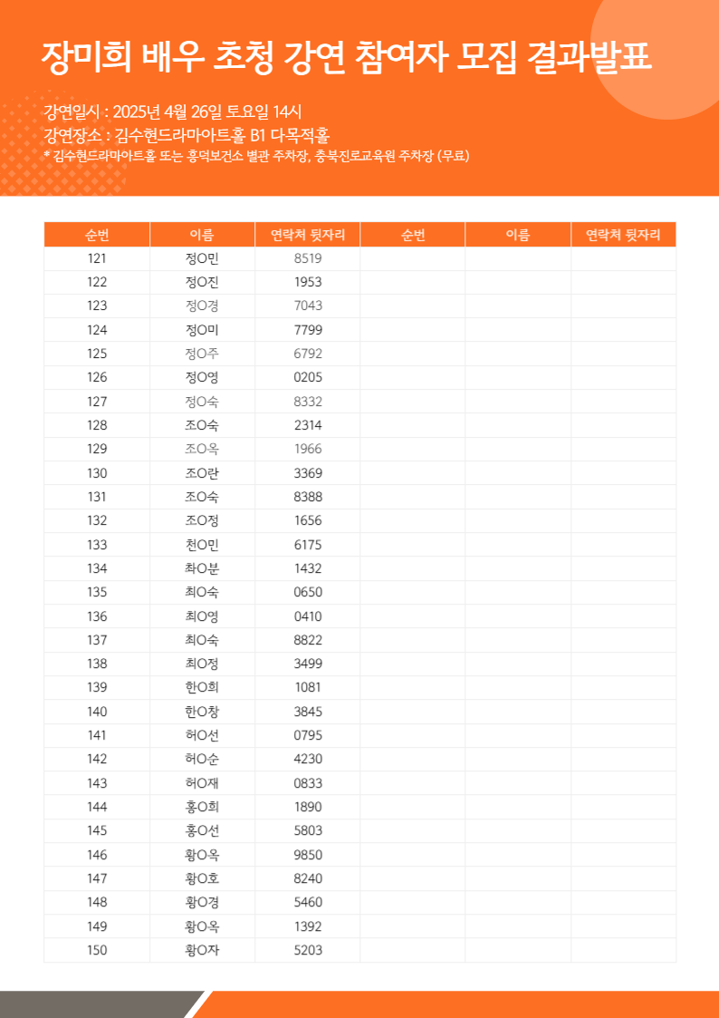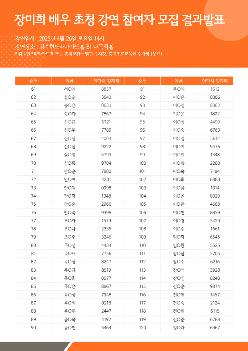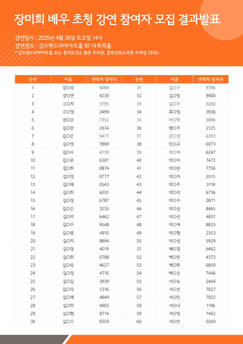 [행사안내] - 일시: 2025년 4월 26일 (토) 14시 - 장소: 김수현드라마아트홀 B1 다목적홀 - 문의: 043-225-9262 ※ 행사 당일 시작 20분 전까지 도착 부탁드립니다. |