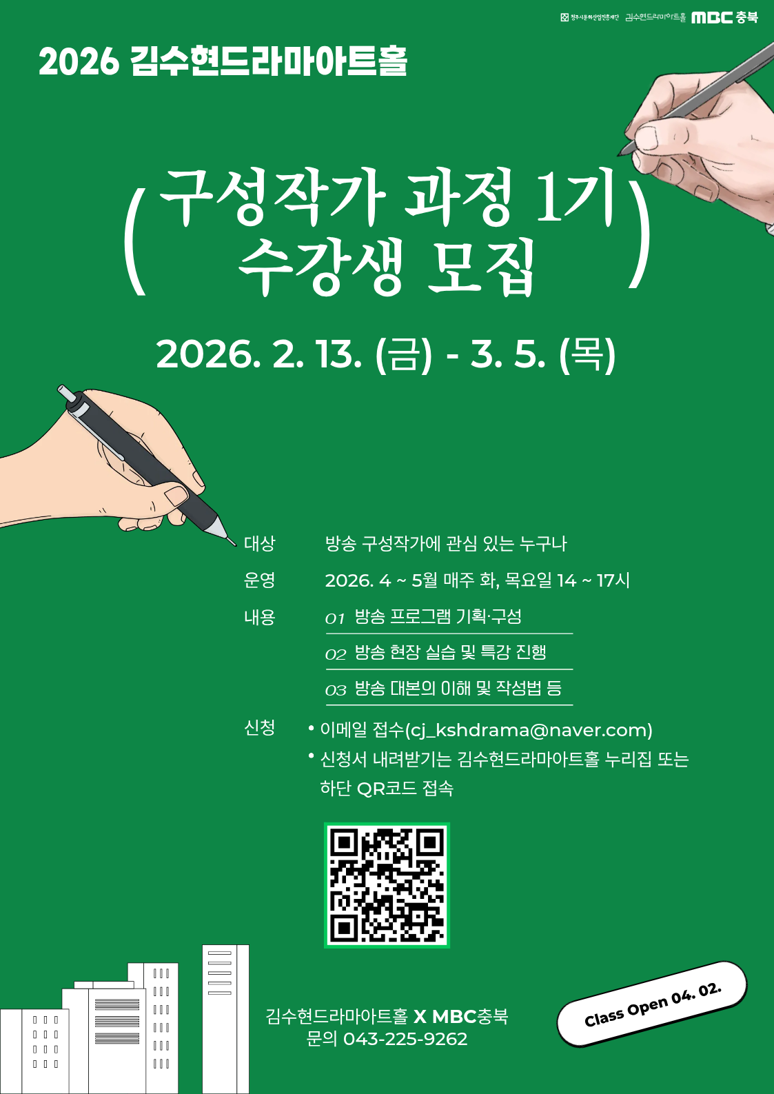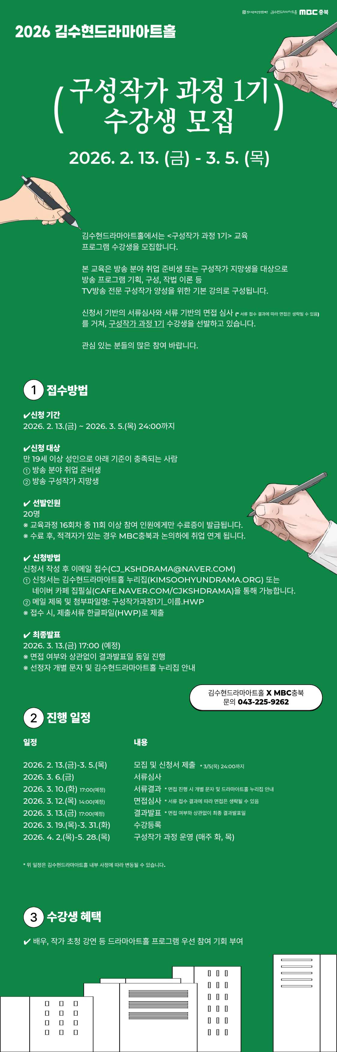교육기간 2026. 4. 2.(목) ~ 20206. 5. 28.(목) / 매주 화, 목 14:00 ~ 17:00 접수방법 - 신청 기간: 2026. 2. 13.(금) ~ 2026. 3. 5.(목), 24:00까지 - 신청 대상: 만 19세 이상 성인으로 아래 기준이 충족되는 사람 ① 방송 분야 취업 준비생 ② 구성작가 지망생 선발인원: 20명 ※ 교육과정 16회차 중 11회 이상 참여 인원에게만 수료증이 발급됩니다. ※ 수료 후, 적격자가 있는 경우만 MBC충북과 논의하에 취업 연계됩니다. -신청방법: 신청서 작성 후 이메일 접수(cj_kshdrama@naver.com) ① 신청서는 김수현드라마아트홀 누리집(kimsoohyundrama.org) 또는 네이버 카페 집필실(cafe.naver.com/cjkshdrama)을 통해 가능합니다. ② 메일 제목 및 첨부파일명: 구성작가과정1기_이름.hwp ※ 접수 시, 제출서류 한글파일(hwp)로 제출 -최종발표: 2026. 3. 13.(금) ※ 면접 여부와 상관없이 결과발표일 동일 진행 ※ 선정자 개별 문자 및 김수현드라마아트홀 누리집 안내 문의 ☎ 043-225-9262 |