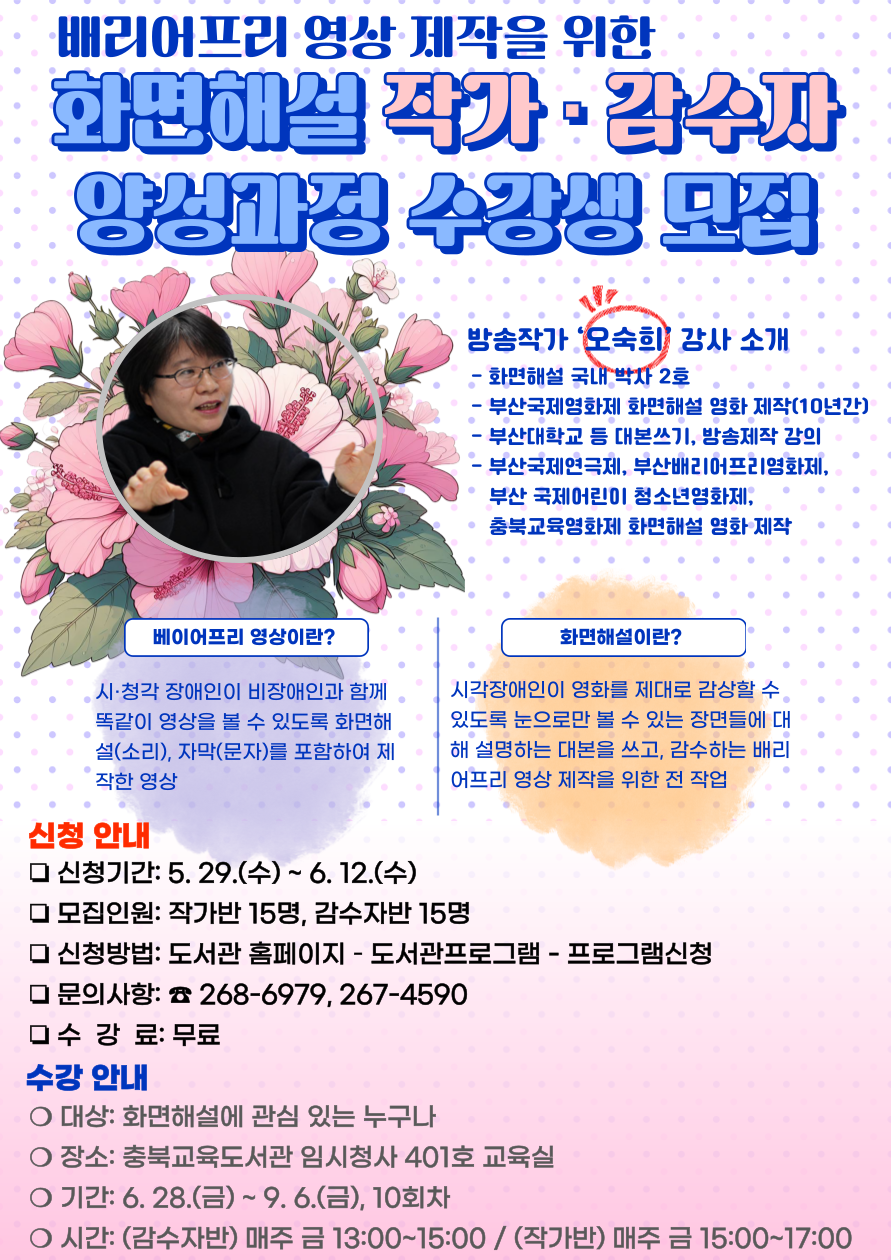 [충북교육도서관] 배리어프리 영상 제작을 위한 화면해설 작가·감수자 양성과정 수강생 모집 (~6/12) 상세보기 - 제목,내용,파일 정보 제공